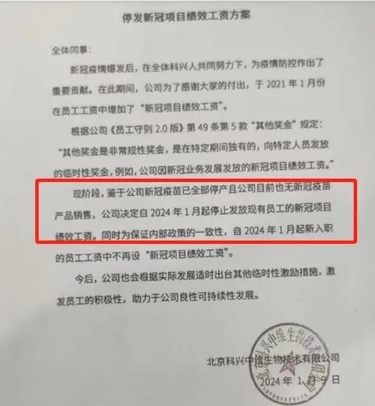 1月10日,一份名为“停发新冠项目绩效工资方案”并盖有北京科兴中维生物技术公司(简称“科兴中维”)公章的文件图片在业内流传。文件图片提到,公司新冠疫苗已全部停产,目前也无新冠疫苗产品销售,公司决定自2024年1月起停止发放现有员工的新冠项目绩效工资。此后#科兴新冠疫苗已停产#话题冲上热搜。