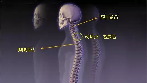 如图所示:颈椎生理曲度向前凸,胸椎生理曲度向后凸,一前一后,在颈7和胸1部位形成一个转折。上段胸椎后凸过大或者颈椎前探,势必会引起转折点过弯,造成该出肌肉彭隆,形成所谓的“富贵包”。